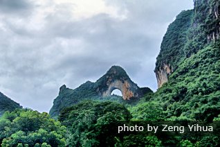 Гора Складчатая парча – один из наиболее известных и посещаемых парков в Гуйлине. В нем можно подняться круто вверх по каменным ступеням на гору и оттуда обозреть город и окружающие его холмы, увидеть старые письмена, посетить павильоны и пройти сквозь гору по пещере, находящейся внутри горы. У подножия горы есть пещера, которая проходит сквозь гору. С одной стороны пещера имеет два довольно широких входа, а с другой – один, очень узкий – настолько, что сквозь него может пройти только один человек. Прохладный ветер дует в пещере круглый год, поэтому ее прозвали Ветряная пещера. Внутри пещеры установлено 90 скульптур Будды. Можно также увидеть десятки надписей, сделанных во времена правления династий Тан и Сун. После Ветряной пещеры, следуя по узкой каменной тропе наверх, можно выйти к павильонам, в которых хорошо сделать остановку на пути к вершине - пику Яркая луна. Это самая высокая точка горы – 223 метра над уровнем моря. Но только 70 метров выше уровня реки Ли. Находясь в одном из павильонов можно насладиться широкой панорамой города.